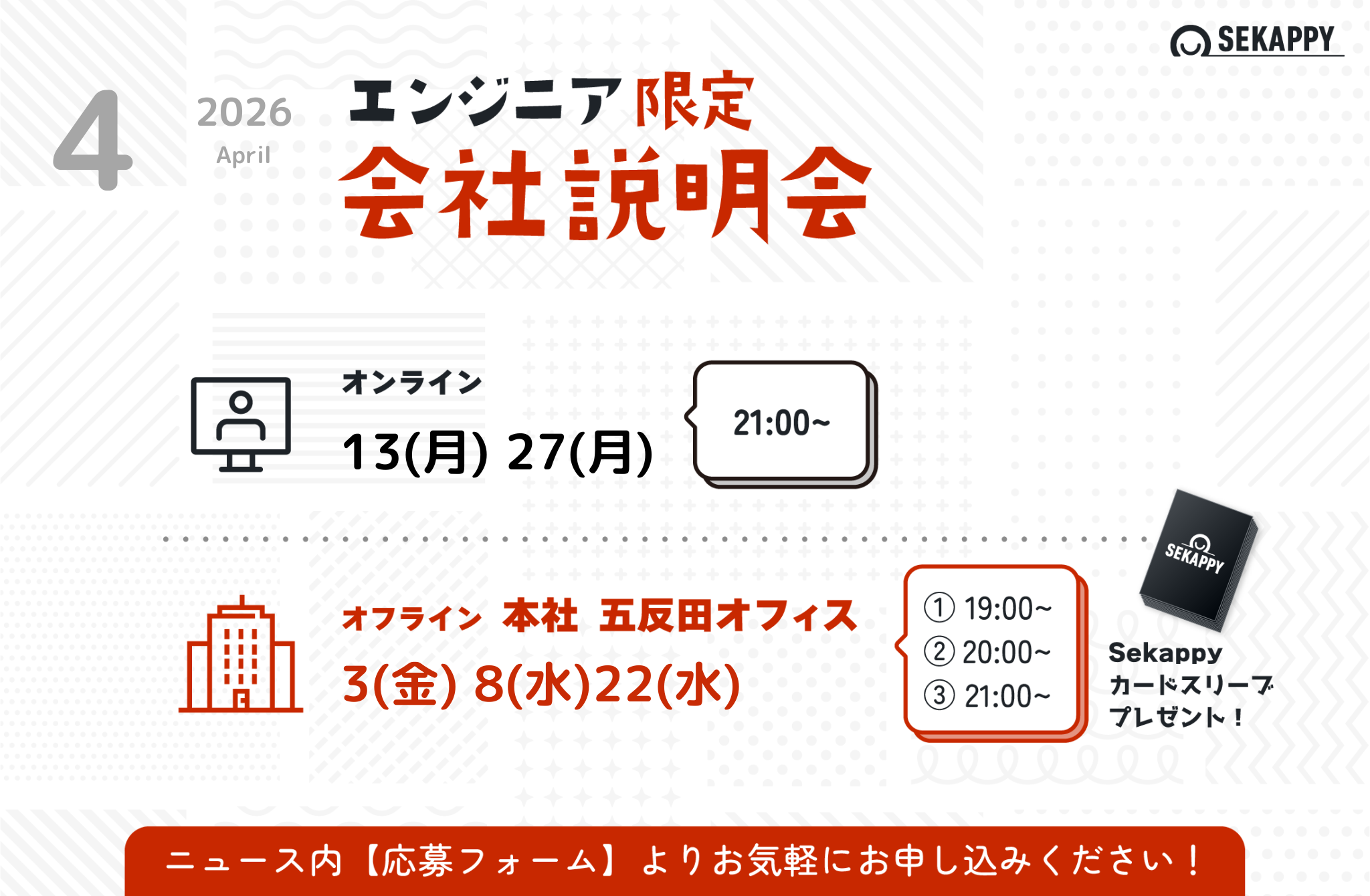 株式会社Sekappyでは、上記の日程で2026年4月の会社説明会を実施いたします。